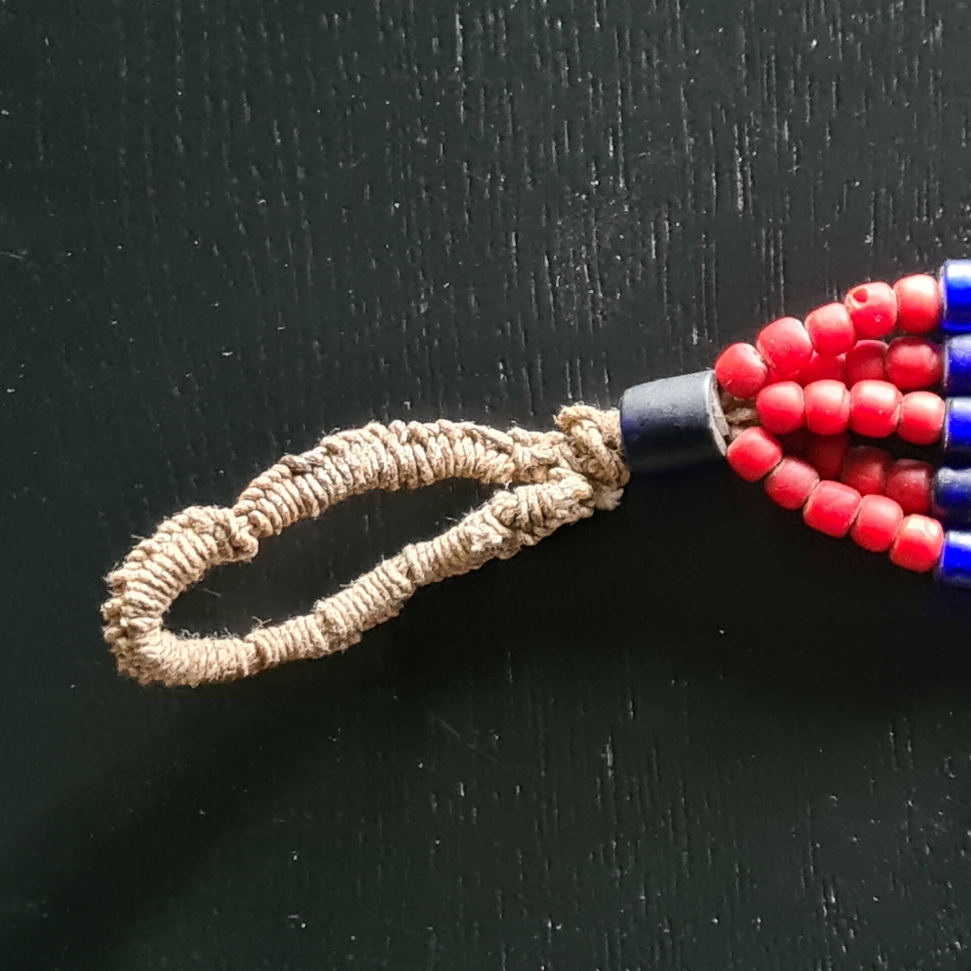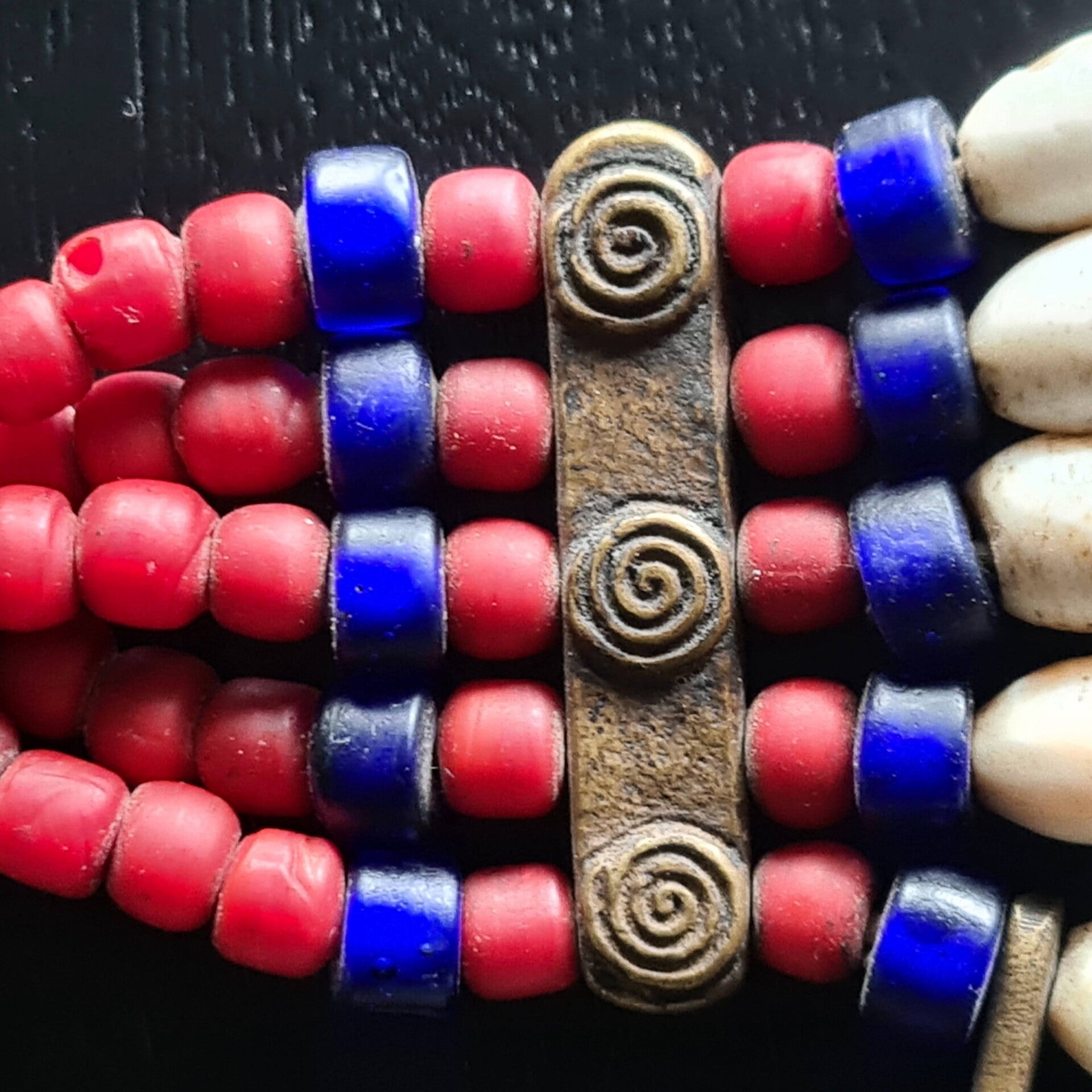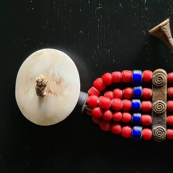 A five-strand glass beads necklace, with bronze bells and elements in horn, bone and shell.
