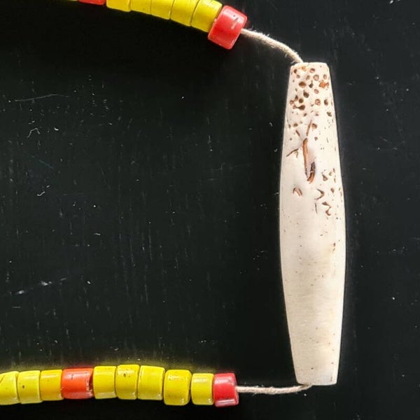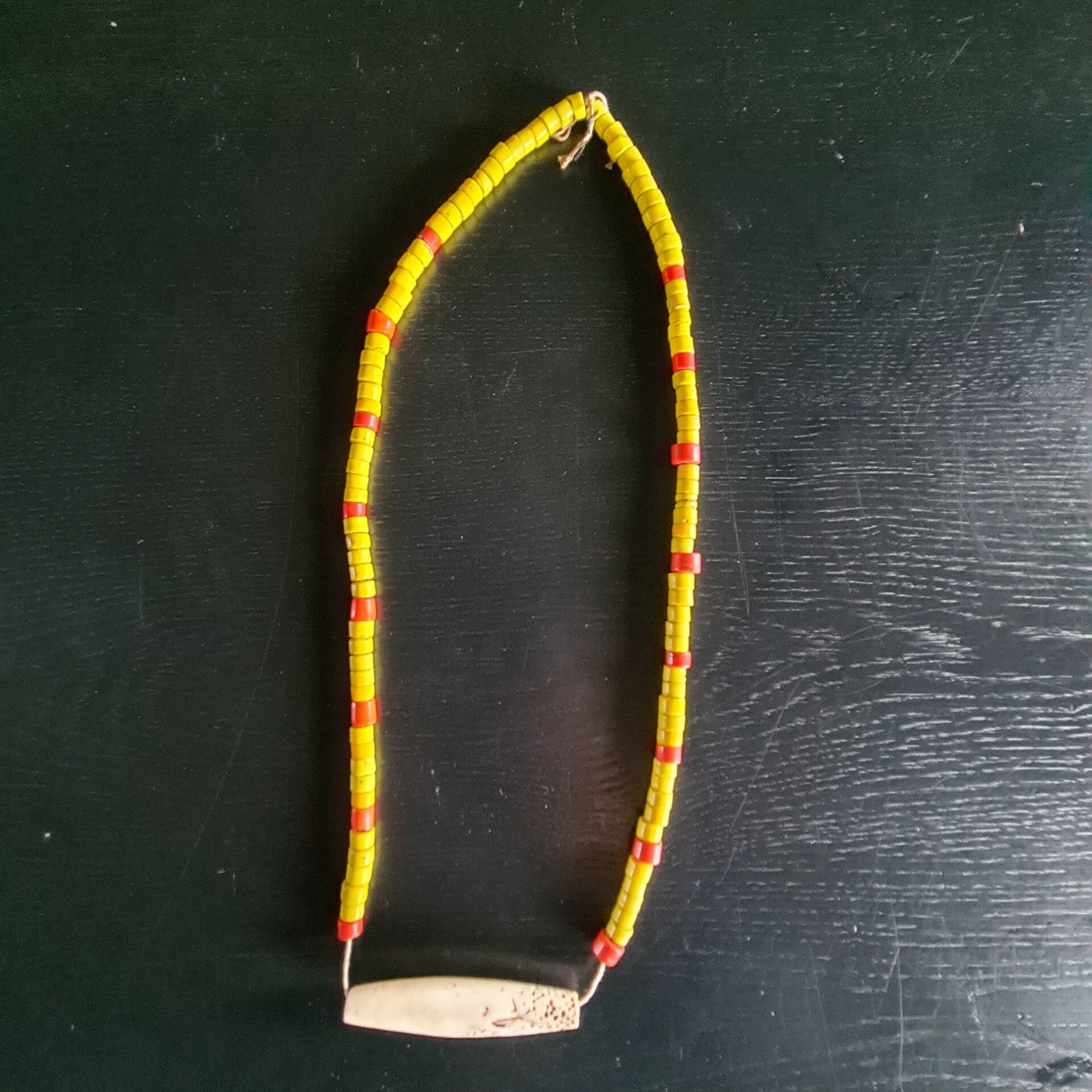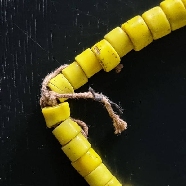 Old nacklace with yellow/red beads with circulair shaped seashell.