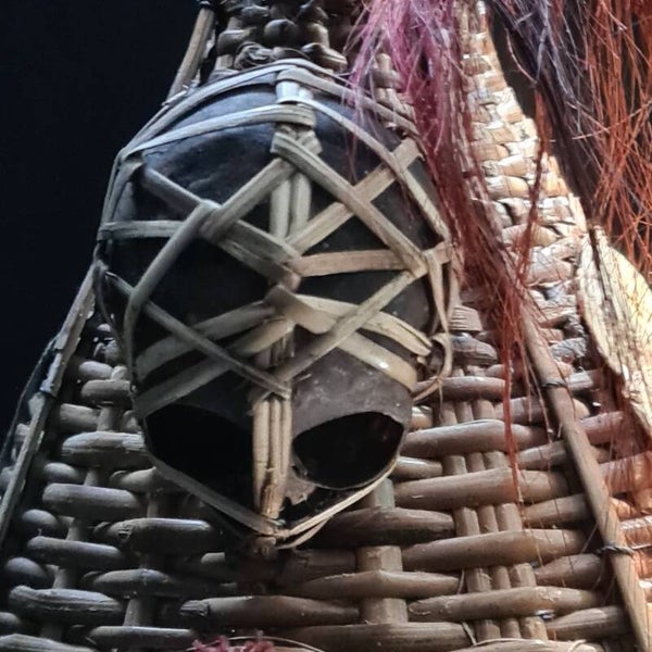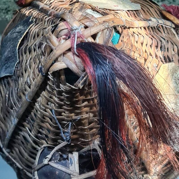 An interesting ceremonial warrior hat formed from braided rattan fibers with a reinforced lower brim. The lateral wall is ornamented with a crescent-shaped boar tusk, a tooth and a monkey skull