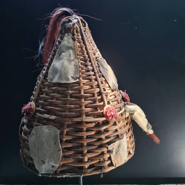 Old conical hat with dyed hair, a boar tusk, teeth and a monkey skull
